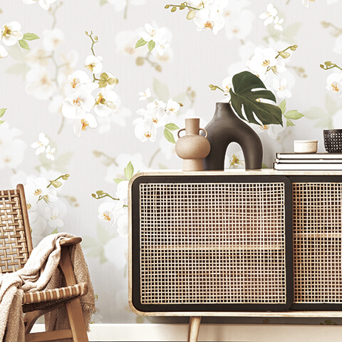 - Пятый сет выполнен в флористическом 3D-стиле и представляет собой шикарные ветви орхидей. За счет изображения высокой четкости, определенного нанесения текстуры на полотна обоев, на стене создается объемный эффект.